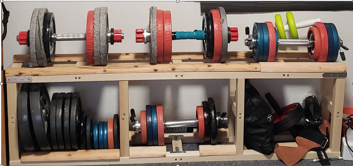 ダンベル2セット、プレートが10枚以上のプレート合わせて150kg以上のダンベル関連をコンパクトに収納できるダンベルラックを自作しました。