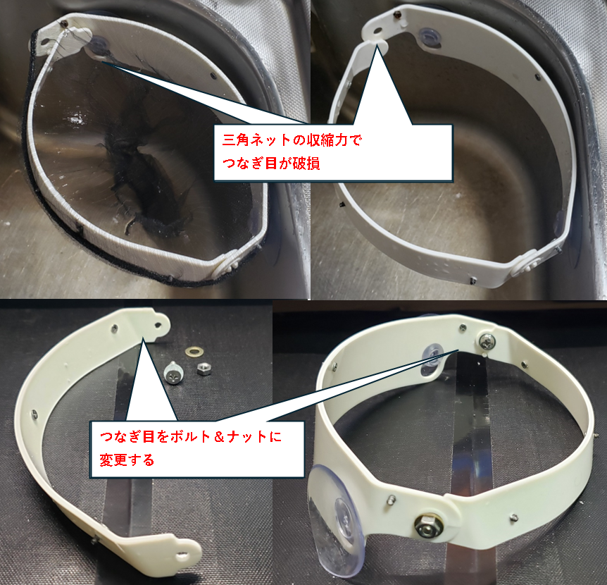 折り畳み部分のプラスチックが折れていた。三角ネットの収縮する力に負けたようなので