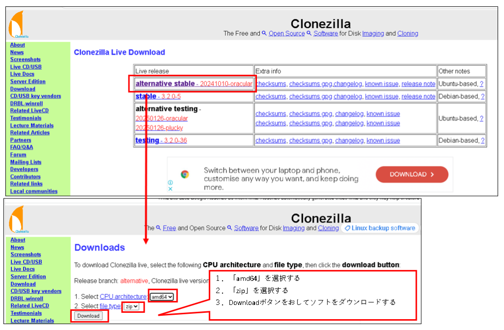 Clonezilla のURLよりClonezillaをダウンロードする。