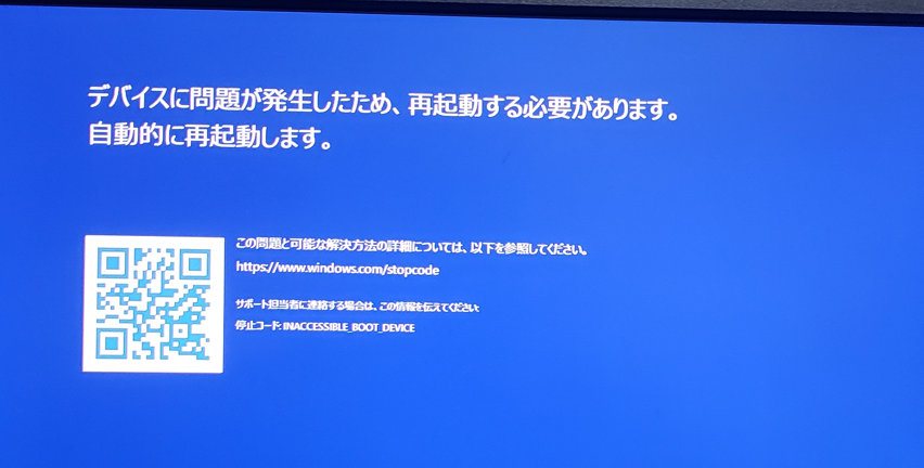 再起動でWindowsのブルースクリーン(INACCESSIBLE_BOOT_DEVICE)が発生いたしました。