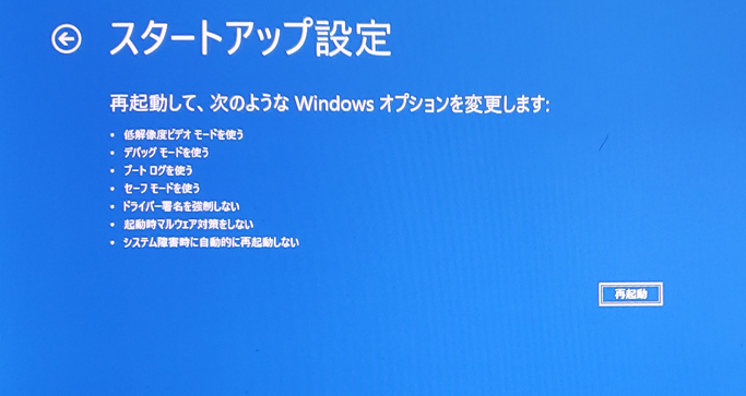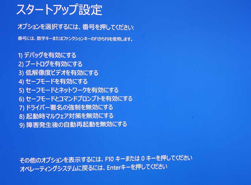 再起動後のスタートアップ設定画面で 4)セーフモードを有効にするを選択(4のキーを押す)