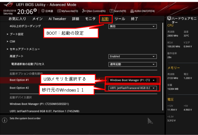 3.USBメモリからPCが起動するようにBIOSを変更する