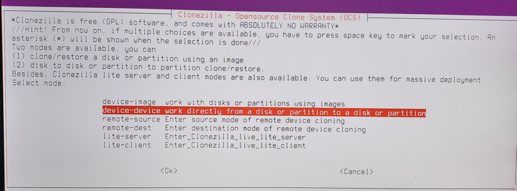 8.(Clonezilla作業)クローン方法を選択する(SSDからSSDなのでdevice-device)