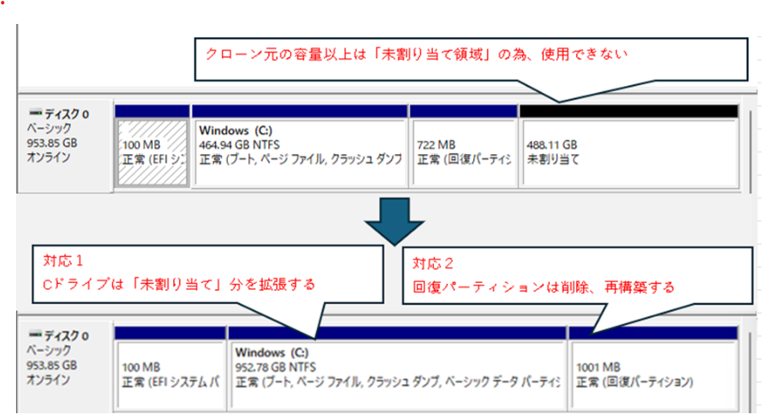「未割当て領域」を利用するには「未割当て領域」をCドライブとして拡張し、Windowsの復元等に必要な「回復バーティション」の削除、再構築が必要となります。