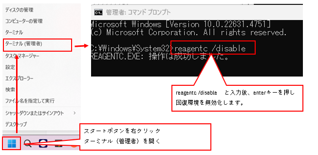 「reagentc /disable」コマンドで、回復環境を無効化します。