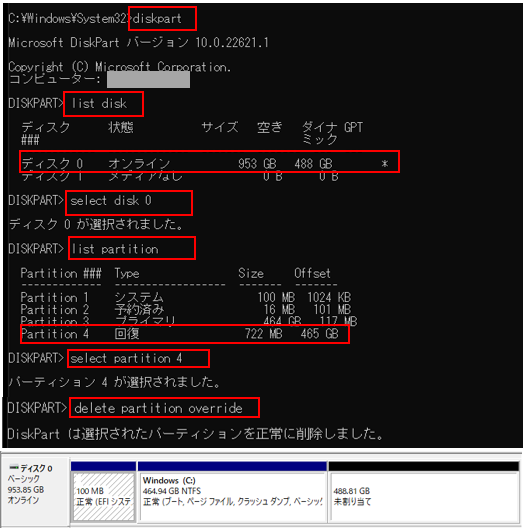 「delete partition override」と入力し回復パーティションのパーティション4を削除します。