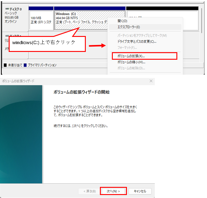 ボリュームの拡張ウィザードが開始されますので指示にしたがって拡張をします。