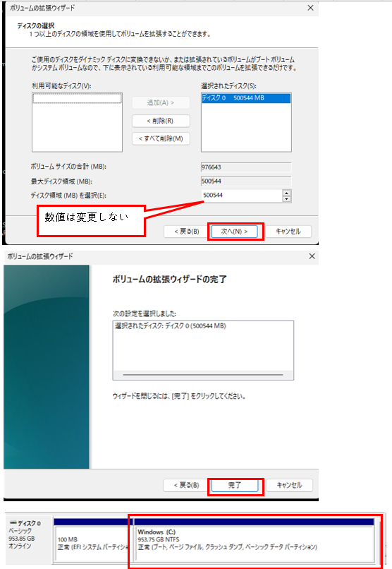 ディスクの管理でCドライブが拡張されたことを確認します。