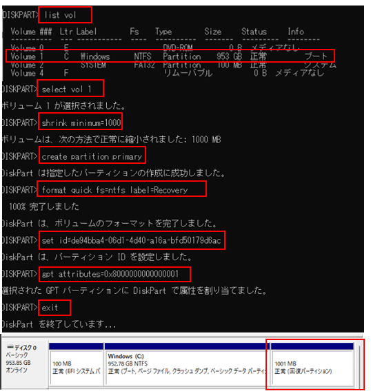 ディスクの管理で回復パーティションが再構築されたことを確認します