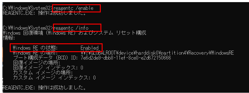 reagentc /info を入力し回復環境を確認します。(Windows REの状態がEnabledであること)